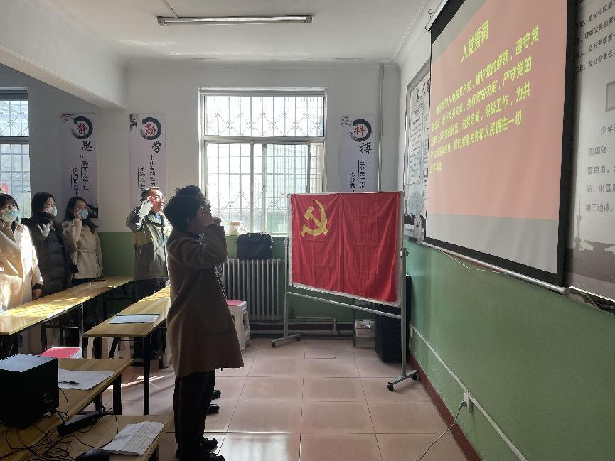 晉煤機關社區黨總支書記何姍姍同志帶領全體黨員重溫入黨誓詞。“我志愿加入中國共產黨,擁護黨的綱領,遵守黨的章程…”,在場全體黨員舉起右拳,面對黨旗,莊嚴宣誓,誓言鏗鏘有力,彰顯了責任與擔當。
